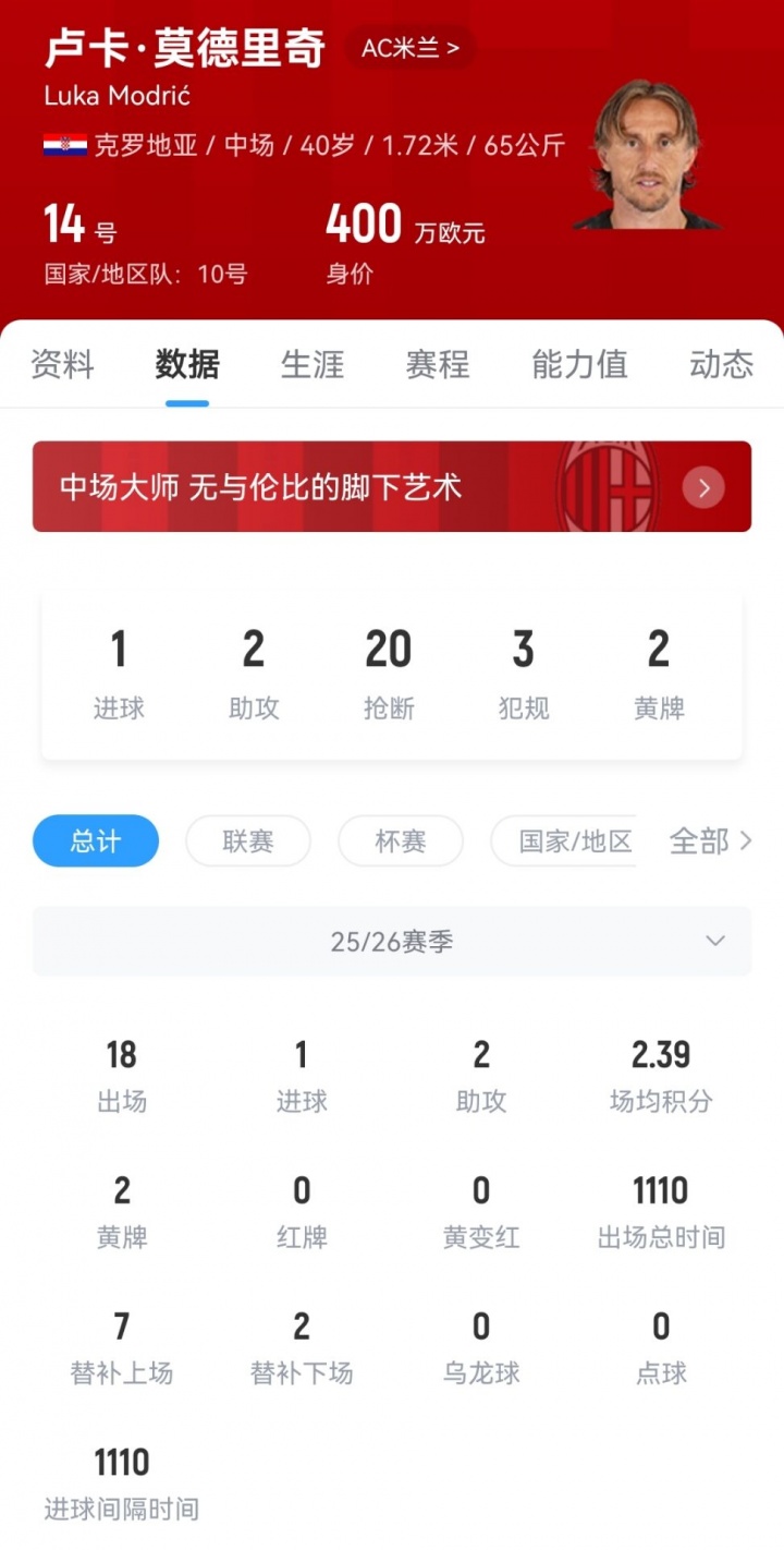 足球比分网11月15日讯 凌晨欧洲区世预赛,克罗地亚3-1战胜法罗群岛,提前一轮锁定了世界杯正赛的席位。40岁的莫德里奇依旧首发出战。 今年夏天莫德里奇离开了效力13年的皇马,加盟AC米兰,40岁的魔笛也用表现证明了自己的油箱里还有油。 本赛季意甲11轮比赛,莫德里奇全部首发出场,且只有两次被换下,为球队贡献了1球2助攻。而米兰在联赛首轮不敌克雷莫内塞后,就没尝过败仗,目前6胜4平1负排在意甲第3位。 而在克罗地亚,莫德里奇依旧是球队的中场核心,世预赛7场全勤,4场首发3场替补,贡献1球2助攻。 本赛季在AC米兰一周一赛的节奏对于莫德里奇来说比较友好,明年我们将可以看到他第5次登上世界杯的赛场,俱乐部方面米兰也有计划与这位老将再续约1年。
