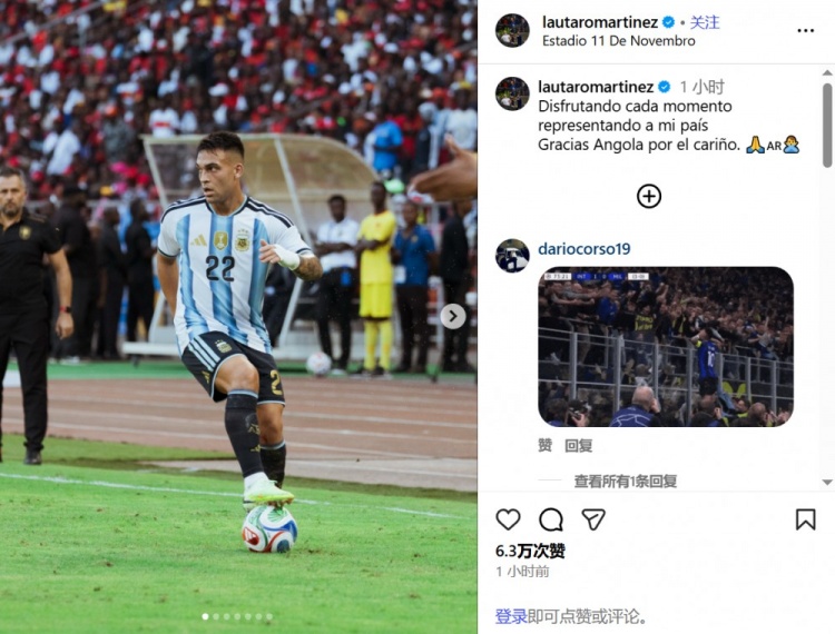 足球比分网11月15日讯 在友谊赛2-0战胜安哥拉后,阿根廷前锋劳塔罗在社交媒体上晒图,庆祝球队获胜。 劳塔罗晒出在比赛中的照片,并配文写道:“代表祖国出战的每一刻都让我无比享受,感谢安哥拉球迷的爱。” |