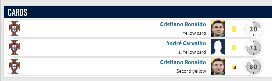 2、2003-04赛季,英超,曼联2-0维拉(2黄变1红) 1黄:倒地被判假摔 2黄:响哨后仍完成射门 3、2005-06赛季,英超,曼联1-3曼城(直红) 飞铲染红 4、2007-08赛季,英超,曼联1-1朴茨茅斯(直红) 头顶对手染红 5、2008-09赛季,英超,曼联1-0曼城(2黄变1红) 1黄:战术犯规,背后踢倒对手 2黄:抢点时故意手球 6、2009-10赛季,西甲,皇马2-0马拉加(2黄变1红) 1黄:进球后脱衣庆祝 2黄:报复性踢人 7、2009-10赛季,西甲,皇马4-2阿尔梅里亚(直红) 肘击对手染红 8、2012-13赛季,国王杯决赛,皇马1-2马竞(直红) 附加报复动作染红 9、2013-14赛季,西甲,皇马1-1毕尔巴鄂竞技(直红) 冲突中手抓对手头发染红 10、2014-15赛季,西甲,皇马2-1科尔多瓦(直红) 故意踢人染红 11、2017-18赛季,西班牙超级杯决赛,皇马3-1巴萨(2黄变1红) 1黄:进球后脱衣庆祝 2黄:禁区内摔倒被判假摔 12、2018-19赛季,欧冠,尤文2-0瓦伦西亚(直红) 抓对手头发染红 13、2023-24赛季,沙超杯,利雅得胜利1-2利雅得新月(直红) 肘击对手染红 14、2025年,世预赛欧洲区,葡萄牙0-2爱尔兰(直红) 肘击对手染红