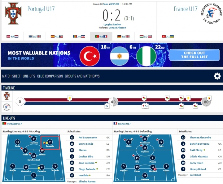 足球比分网11月14日讯 世预赛欧洲区小组赛F组第5轮,葡萄牙0-2客负爱尔兰,C罗肘击被直红罚下。 ESPN发文盘点C罗职业生涯的所有红牌,一共14张红牌,他第一次被罚下是在2002年4月28日,在U17欧洲杯的小组赛阶段。 此外,C罗在曼联时期4红,其中2张是在曼市德比;皇马时期6红,其中2张是在决赛;尤文时期1红,这是C罗在欧冠唯一一次染红;利雅得胜利时期1红、成年国家队1红。 ESPN盘点C罗职业生涯中的所有红牌: 1、2002年,U17欧洲杯,葡萄牙U17 0-2 法国U17(2黄变1红)