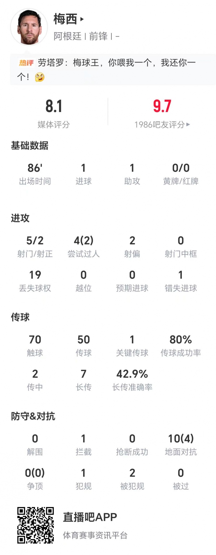 传射建功!梅西本场数据:5射两正,1次关键传球