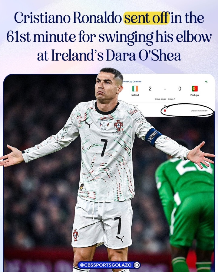 足球比分网11月14日讯 世预赛欧洲区小组赛F组第5轮,葡萄牙0-2客负爱尔兰,C罗肘击被直红罚下。世欧预末轮,葡萄牙主场战亚美尼亚,C罗将停赛。 BBC记者Dale Johnson发文: C罗因暴力行为被VAR审查后罚下,他将错过葡萄牙在2026世界杯的首场比赛。 他应该会被禁赛2场,假设葡萄牙直通世界杯,这2场将在世预赛末轮对阵亚美尼亚的比赛和世界杯小组赛首场比赛执行。 在国际比赛中,球员只会自动禁赛1场,任何追加处罚都将由纪律委员会决定。与英格兰足球不同,暴力行为不会自动停赛3场。