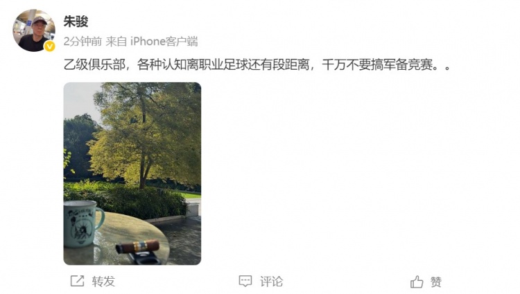 足球比分网11月16日讯 在个人社媒,上海赛更达橘橙投资人朱骏谈到了俱乐部冲乙的情况。 今年中冠联赛,上海赛更达橘橙冲乙成功,该俱乐部投资人是前申花老板朱骏。据报道,朱骏为球队开出400万冲乙奖金。 今天,朱骏在个人微博晒照,他同时配文:乙级俱乐部,各种认知离职业足球还有段距离,千万不要搞军备竞赛。。 |