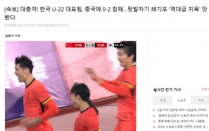 足球比分网11月15日讯 今日熊猫杯,U22国足2-0战胜韩国,拜合拉木梅开二度。韩媒xportsnews赛后第一时间发文,并称本场比赛为前所未有的耻辱。 韩媒标题:【突发新闻】震惊!韩国U22队0-2惨败中国......一记脚后跟破门锁定胜局,这是一场前所未有的耻辱。 韩媒文章写道:这是一起令人震惊的事件。韩国足球遭遇了一场难以置信的惨败。 由李珉成教练率领的韩国U22国家队在15日(韩国时间)于中国成都双流体育中心举行的2025熊猫杯第二场比赛中,以0-2的比分不敌中国队。 三天前,韩国队在首场比赛中以2-0战胜了亚洲足球新星乌兹别克斯坦。而中国队则在0-1负于越南后再次沦为笑柄。 然而,第二场比赛却截然不同。中国队展现出了顽强的斗志,凭借快速而有条不紊的配合,攻入两球,最终战胜韩国队。这对韩国足球来说无疑是一次耻辱性的打击。 韩国队目前战绩为1胜1负,他们将于11月18日下午4点30分与越南队进行最后一场比赛。 李珉成率领的韩国队将在1月U-23亚洲杯结束后,备战9月举行的爱知-名古屋亚运会,这是该届亚运会的重头戏。韩国队的目标是在亚运会上实现四连冠。 然而,上个月在沙特阿拉伯进行的季前训练营中,他们与沙特阿拉伯进行了两场友谊赛,均告负,一球未进,丢六球。如今又爆冷负于中国队,他们很可能在赛季初期就面临诸多批评。