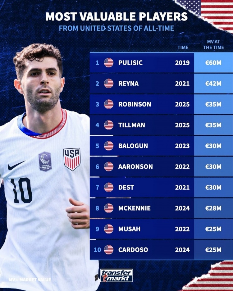 足球比分网11月16日讯 德国转会市场盘点了美国球员历史身价排名,2019年的普利西奇以6000万欧元排名第一。 美国球员历史身价排名: 1、普利西奇(2019),6000万欧元 2、雷纳(2021),4200万欧元 3、罗宾逊(2025),3500万欧元 4、蒂尔曼(2025),3500万欧元 5(并列)、巴洛贡(2023),3000万欧元 5(并列)、阿伦森(2022),3000万欧元 5(并列)、德斯特(2021),3000万欧元 8、麦肯尼(2024),2800万欧元 9(并列)、穆萨(2022),2500万欧元 9(并列)、卡尔多索(2024),2500万欧元 |