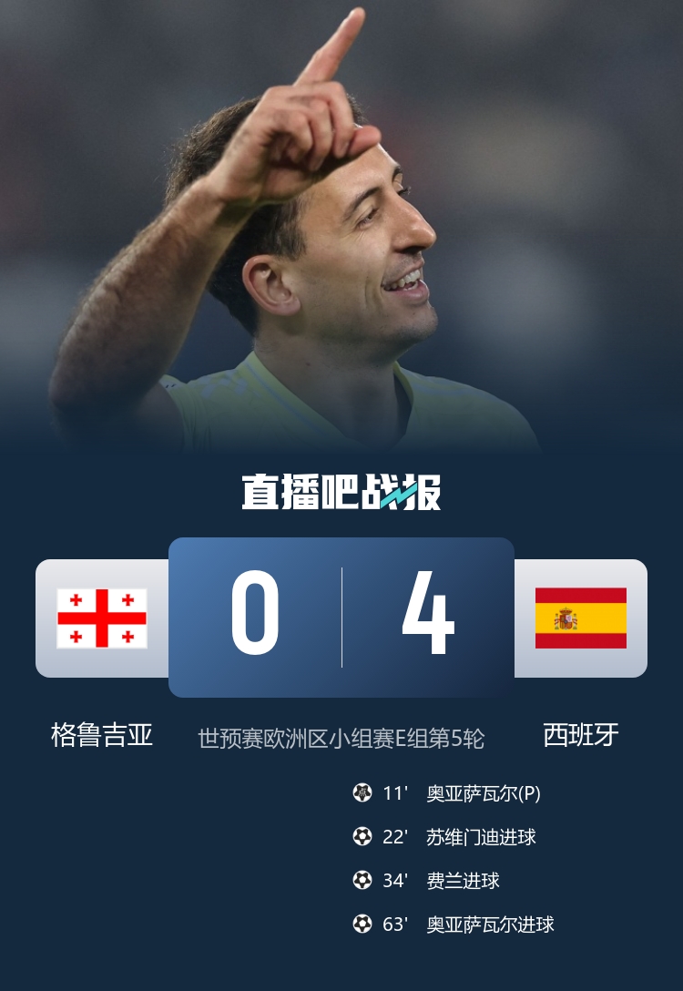 【战报新闻】 西班牙4-0格鲁吉亚继续领跑 费兰造点+传射奥亚萨瓦尔2射1传