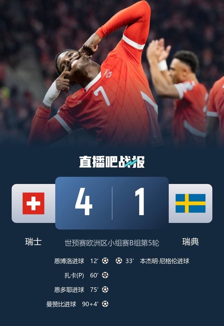 奥亚萨瓦尔双响,苏维门迪、费兰建功,西班牙4-0格鲁吉亚。 瑞士4-1瑞典进军美加墨在望 扎卡点射恩多耶传射瑞典5轮不胜垫底