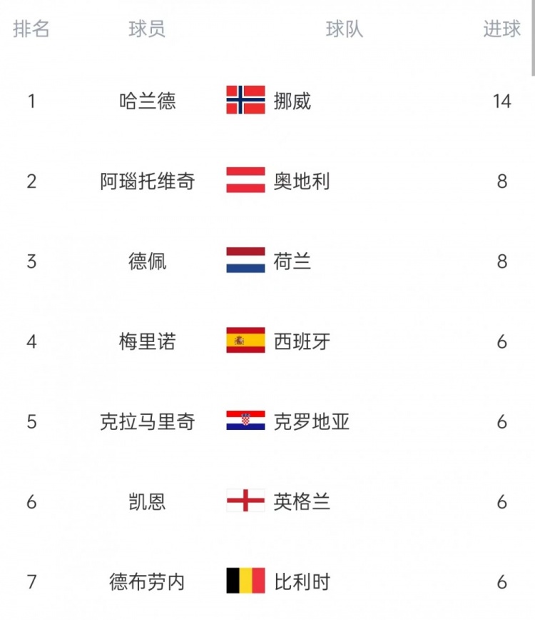 欧洲世预赛射手榜:哈兰德14球断层领跑,阿瑙、