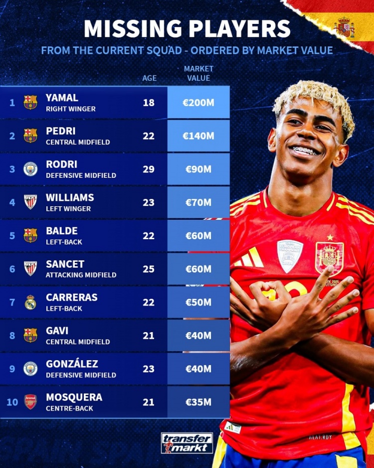 无缘本期西班牙队身价榜:亚马尔2亿欧居首,佩