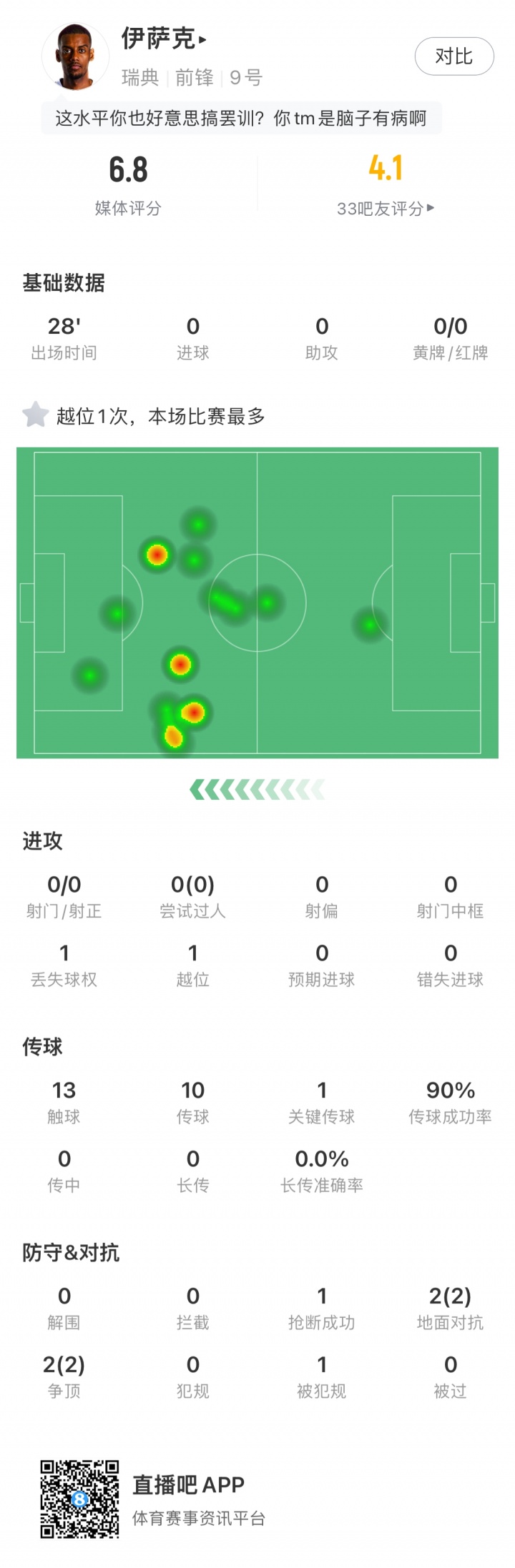 1.4亿瑞典第一身价!伊萨克替补半小时0射门 本届
