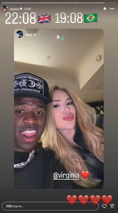 足球比分网11月16日讯 友谊赛巴西2-0塞内加尔,维尼修斯首发出战,第90分钟被恩里克换下。 本场比赛,维尼修斯女友弗吉尼亚身穿巴西7号球衣前往现场观战。赛后维尼修斯晒出了与弗吉尼亚的合照。