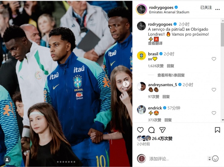 足球比分网11月16日讯 北京时间今天凌晨进行的友谊赛,巴西在酋长球场2-0击败塞内加尔。 此役罗德里戈为巴西队首发出战,定位球助攻卡塞米罗破门,赛后罗德里戈社媒晒照庆祝胜利,配文:“为国出战,感谢伦敦!专注于下一场比赛!”