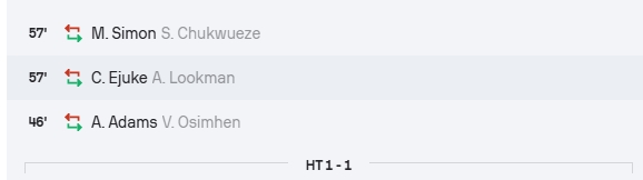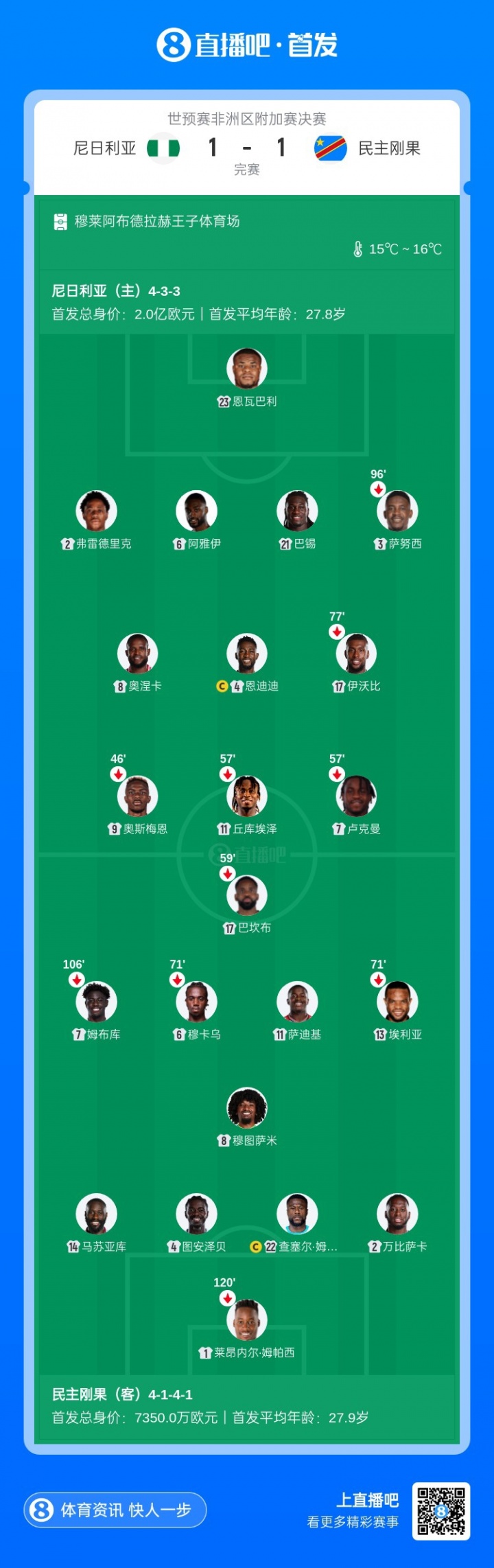 足球比分网11月17日讯 世预赛非洲区附加赛决赛,尼日利亚点球大战不敌民主刚果,连续两届无缘世界杯。比赛中,尼日利亚主帅的换人操作引发热议。 奥斯梅恩因为与对手相撞,头部受伤,下半场一开始被换下场,情有可原。 比赛第57分钟,丘库埃泽、卢克曼也一同被换下场。这也意味着,身价合计1.2亿欧的首发三前锋全部被换下场。 最终,双方均再无建树,点球大战尼日利亚3-4输球出局。