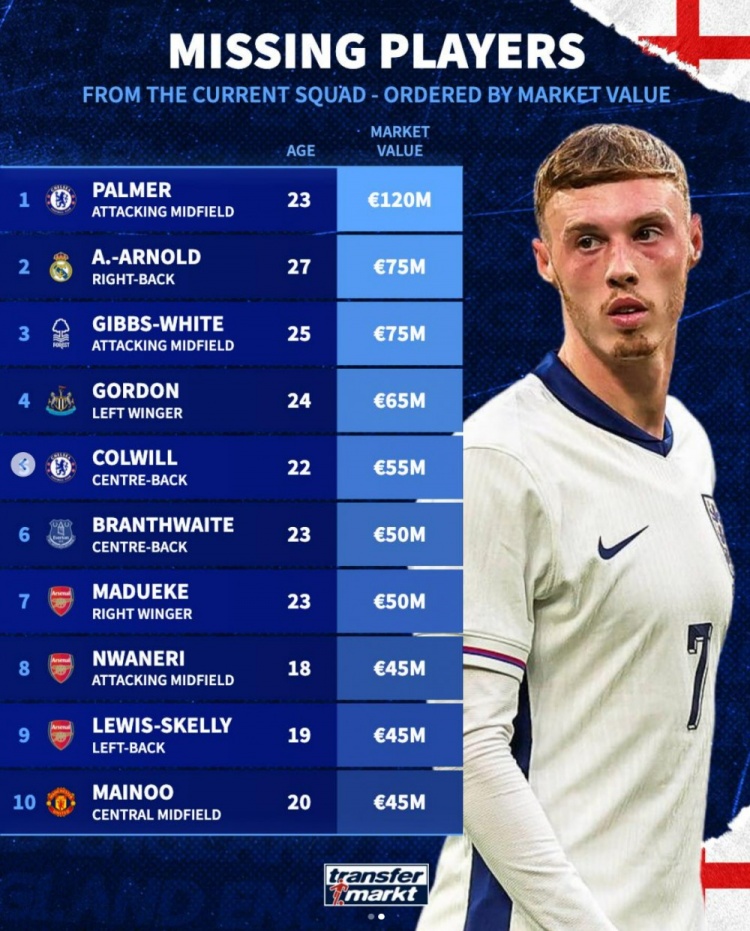 德转列缺席本期英格兰名单身价榜:帕尔默居首