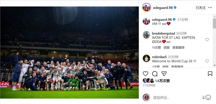 大赛梦圆⚽厄德高社媒晒挪威队大合照:世界杯