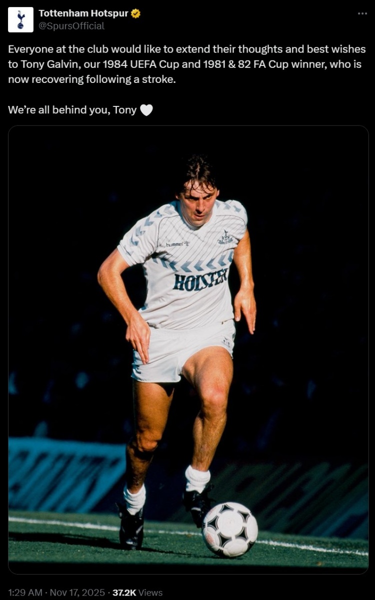 足球比分网11月17日讯 热刺旧将托尼·加尔文目前正处于中风后的康复进程中,热刺在官方社媒发文为其送上祝福。 热刺官方社媒写道:“俱乐部全体成员向托尼·加尔文致以慰问并送上美好的祝福,他是俱乐部在1984年获得欧洲联盟杯冠军、1981、1982年获得足总杯冠军的成员,目前他正处于中风后的康复期。我们都支持你,托尼 |