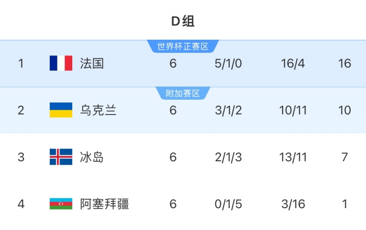 世欧预D组:法国6轮不败16分居首,乌克兰末轮胜