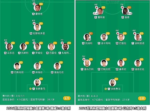 然而这一次,意大利已经不能再拿运气做借口了。面对直接竞争对手挪威,意大利在客场较量中被完全碾压,主场对决同样溃不成军。当哈兰德、瑟尔洛特和努萨等人以砍瓜切菜的姿态收割净胜球时,意大利却在以色列和爱沙尼亚的客场步履蹒跚。防守和进攻能力都很平庸,蓝衣军团拿不到小组第一是必然的。
