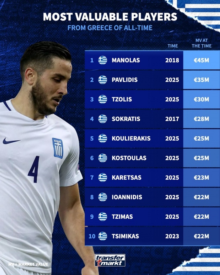 希腊球员历史身价排名:马诺拉斯4500万欧居首,