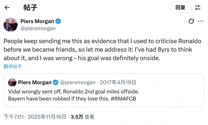 足球比分网11月16日讯 今日著名主持人皮尔斯·摩根在社媒发文,对8年前自己的社媒言论进行道歉,表示自己曾经错怪了C罗。 2017年4月欧冠1/4决赛次回合皇马vs拜仁的比赛,C罗两粒进球有争议,摩根在当时发布了推文,他写道:比达尔被罚下是错误的,C罗第二个进球明显越位,如果拜仁输掉了这场比赛,那他们就是被抢劫了。 而在今日,摩根在社媒再次评论了这条推文,表示:人们不断给我发这个(推文),说是我曾经批评C罗的证据,那是在我和C罗成为朋友之前。所以现在我想对此事进行回应:在经过8年的思考后,我错了,C罗这个球绝对没有越位。 C罗本场两粒争议进球↓ 比达尔铲球后吃到本场第二张黄牌↓