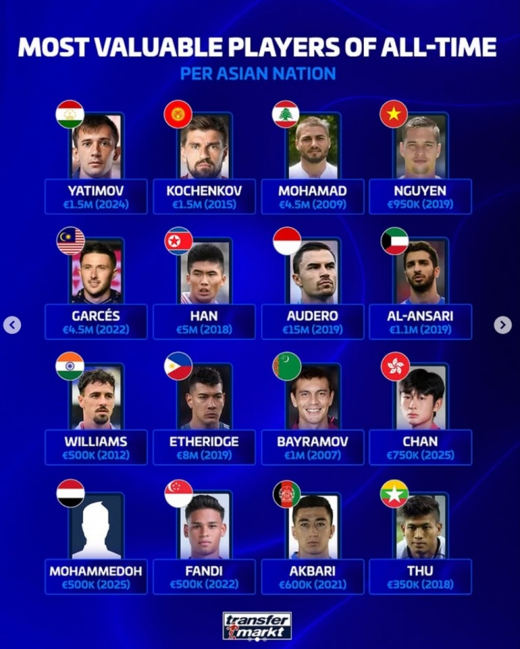 鲁斯塔姆·雅季莫夫:150万欧(塔吉克斯坦,2024年) 科琴科夫:150万欧(吉尔吉斯斯坦,2015年) 优素福·穆罕默德:450万欧(黎巴嫩,2009年) 菲利普·阮:95万欧(越南,2019年) 法昆多·加尔塞斯:450万欧(马来西亚,2022年) 韩光宋:500万欧(朝鲜,2018年) 奥代罗:1500万欧(印尼,2019年) 法赫德·安萨里:110万欧(科威特,2019年) 瑞安·威廉姆斯:50万欧(印度,2012年) 埃瑟里奇:800万欧(菲律宾,2019年) 巴伊拉莫夫:100万欧(土库曼斯坦,2007年) 陈晋一:75万欧(中国香港,2025年) 纳赛尔·穆罕默德:50万欧(也门,2025年) 伊尔凡·凡迪:50万欧(新加坡,2022年) 拉赫马特·阿克巴里:60万欧(阿富汗,2021年) 昂图:35万欧(缅甸,2018年)