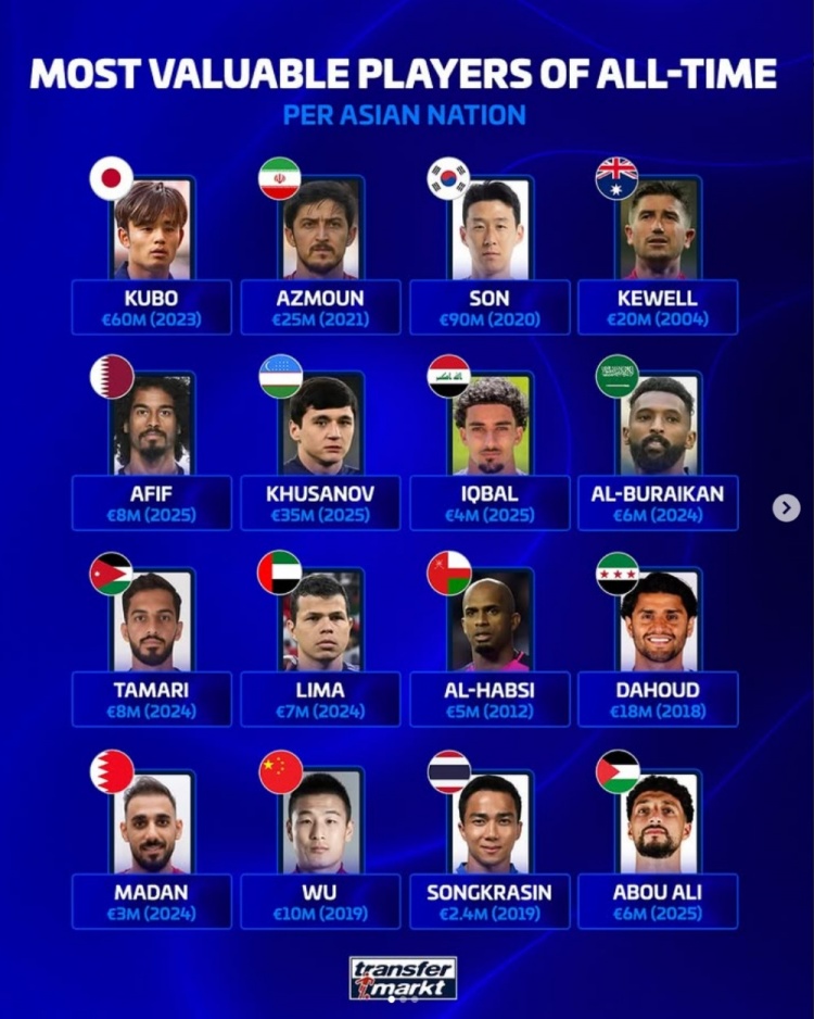 足球比分网11月19日讯 德转盘点了亚足联各队球员历史身价纪录,2020年孙兴慜9000万欧为历史上的球员最高身价。 以下为亚足联各队历史身价最高球员具体身价情况: 久保建英:6000万欧(日本,2023年) 阿兹蒙:2500万欧(伊朗,2021年) 孙兴慜:9000万欧(韩国,2020年) 科威尔:2000万欧(澳大利亚,2004年) 阿菲夫:800万欧(卡塔尔,2025年) 胡桑诺夫:3500万欧(乌兹别克斯坦,2025年) 齐达内·伊克巴尔:400万欧(伊拉克,2025年) 菲拉斯·布赖坎:600万欧(沙特,2024年) 塔马里:800万欧(约旦,2024年) 法比奥·德利马:700万欧(阿联酋,2024年) 哈布西:500万欧(阿曼,2012年) 达胡德:1800万欧(叙利亚,2018年) 阿里·马丹:300万欧(巴林,2024年) 武磊:1000万欧(中国,2019年) 颂克拉辛:240万欧(泰国,2019年) 维萨姆·阿博·阿里:600万欧(巴勒斯坦,2025年)