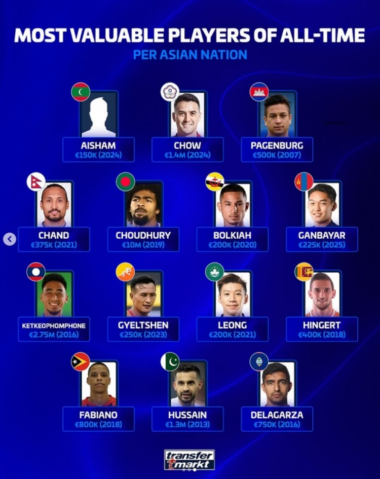 艾沙姆:15万欧(马尔代夫,2024年) 周定洋:140万欧(中国台北,2024年) 帕根博格:50万欧(柬埔寨,2007年) 钱德:37.5万欧(尼泊尔,2021年) 乔杜里:1000万欧(孟加拉国,2019年) 博尔基亚:20万欧(文莱,2020年) 甘比尔:22.5万欧(蒙古,2025年) 凯特克奥福姆:275万欧(老挝,2016年) 吉尔岑:25万欧(不丹,2023年) 梁嘉恒:20万欧(中国澳门,2021年) 欣格特:40万欧(斯里兰卡,2018年) 法比亚诺:80万欧(东帝汶,2018年) 埃扎兹·侯赛因:130万欧(巴基斯坦,2013年) 德拉加尔萨:75万欧(关岛,2016年) |