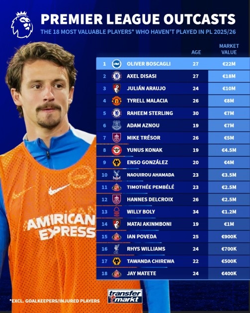 足球比分网11月19日讯 本赛季英超已经进行了11轮,德转列至今仍未出场球员身价排行,布莱顿后卫博斯卡利2000万欧居首,切尔西后卫迪萨西1800万欧第二。 本赛季英超仍未出场球员身价排行: *榜单中一共有18名非门将球员,这些球员没有受到伤病困扰,但至今未在本赛季英超出战过1分钟。 1、博斯卡利(布莱顿):2000万欧 2、迪萨西(切尔西):1800万欧 3、朱利安·阿劳霍(伯恩茅斯):1000万欧 4、马拉西亚(曼联):800万欧 5、斯特林(切尔西):700万欧 阿兹努(埃弗顿):700万欧 7、特雷索(伯恩利):500万欧 8、科纳克(布伦特福德):450万欧 9、恩索·冈萨雷斯(狼队):400万欧 10、阿哈马达(水晶宫):350万欧 11、彭贝莱(桑德兰):250万欧 德克鲁瓦(伯恩利):250万欧 13、博利(诺丁汉森林):120万欧 14、阿金博尼(伯恩茅斯):100万欧 15、波维达(桑德兰):90万欧 16、里斯·威廉斯(利物浦):70万欧 17、奇雷瓦(狼队):50万欧 18、马泰特(桑德兰):40万欧