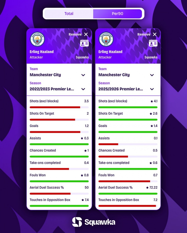 足球比分网11月18日讯 Squawka统计了哈兰德22-23赛季(英超36球创纪录)和本赛季的数据,并做出对比。 哈兰德22-23赛季、本赛季英超每90分钟数据: 射门——3.5比4.1 射正——2比2.6 进球——1.2比1.4 助攻——0.3比0.1 创造机会——1比0.5 完成过人——0.4比0.6 被犯规——0.8比0.7 争顶成功率——50%比72.22% 对方禁区内触球——7.4比7.2 |