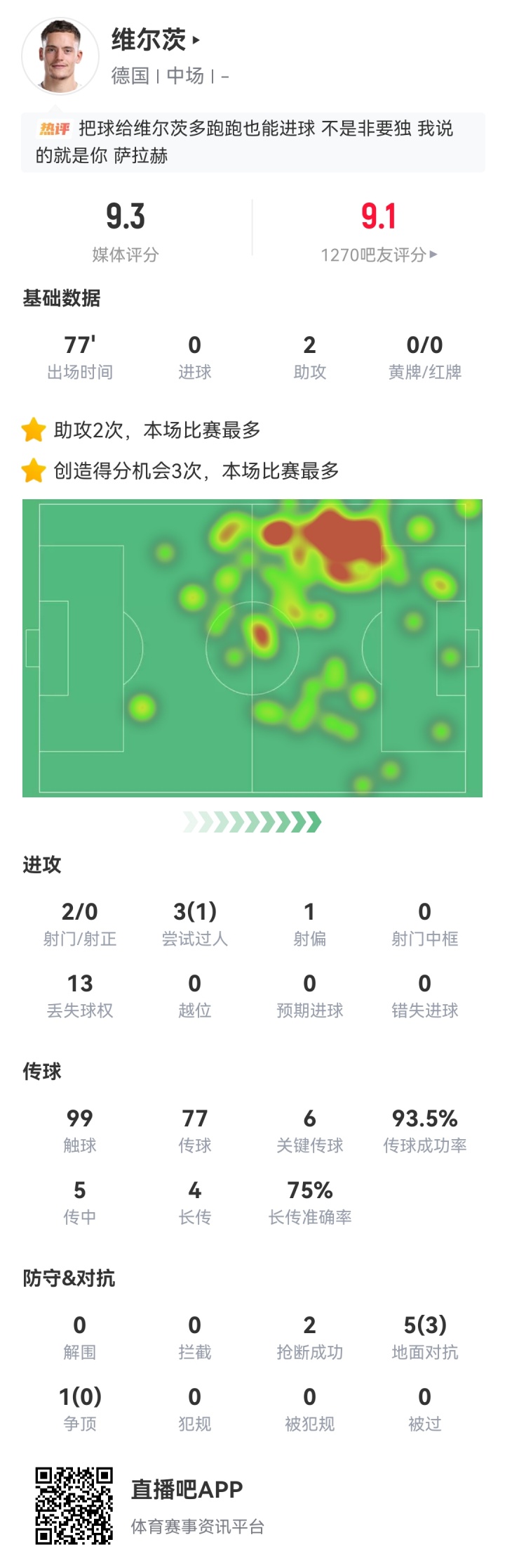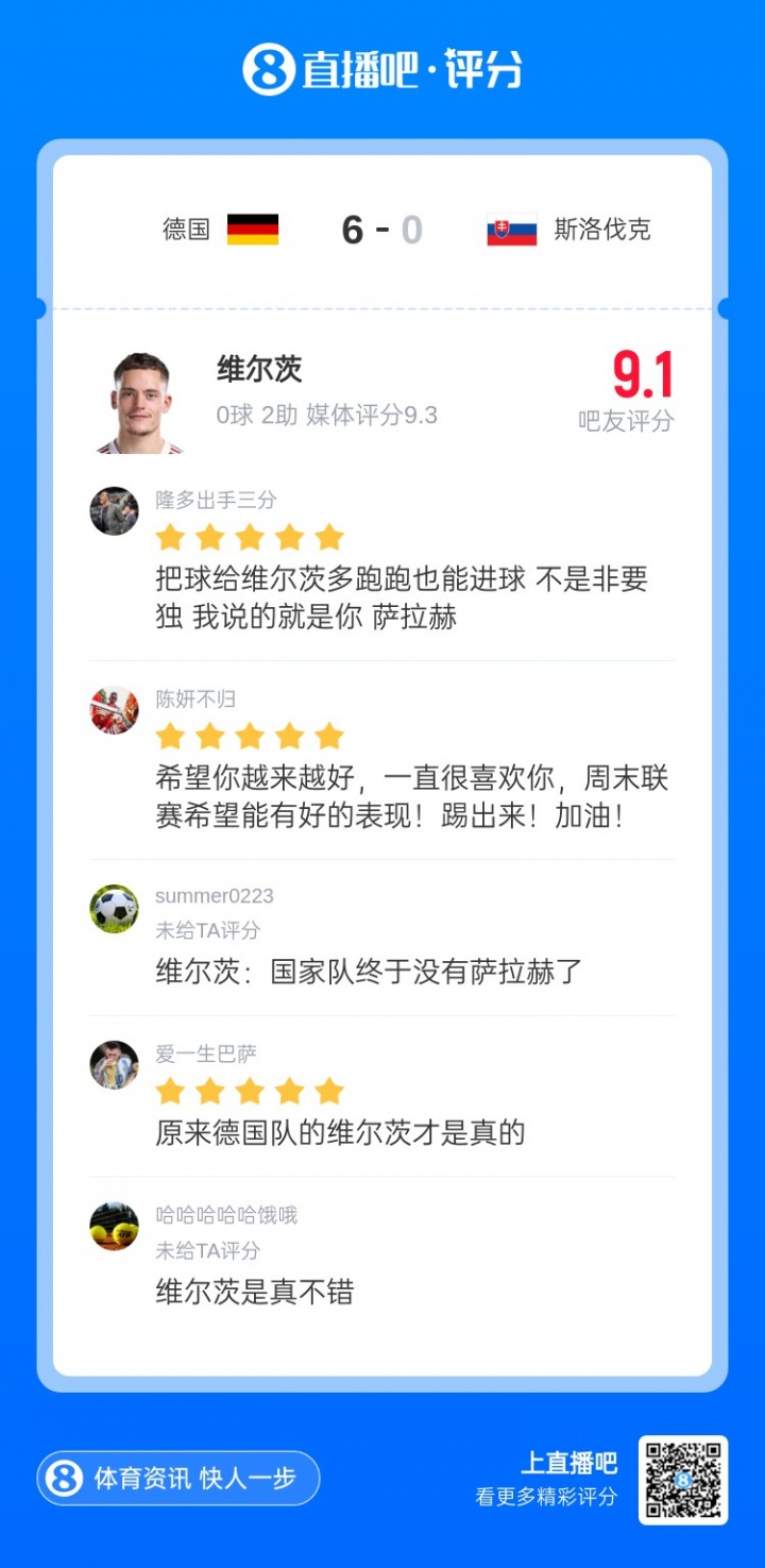 凌晨世预赛欧洲区最后一轮,德国6-0大胜斯洛伐克,顺利取得直通世界杯的名额。本场比赛维尔茨首发出战77分钟,送出两次助攻,优异的表现获得了吧友9.1分的评分。
