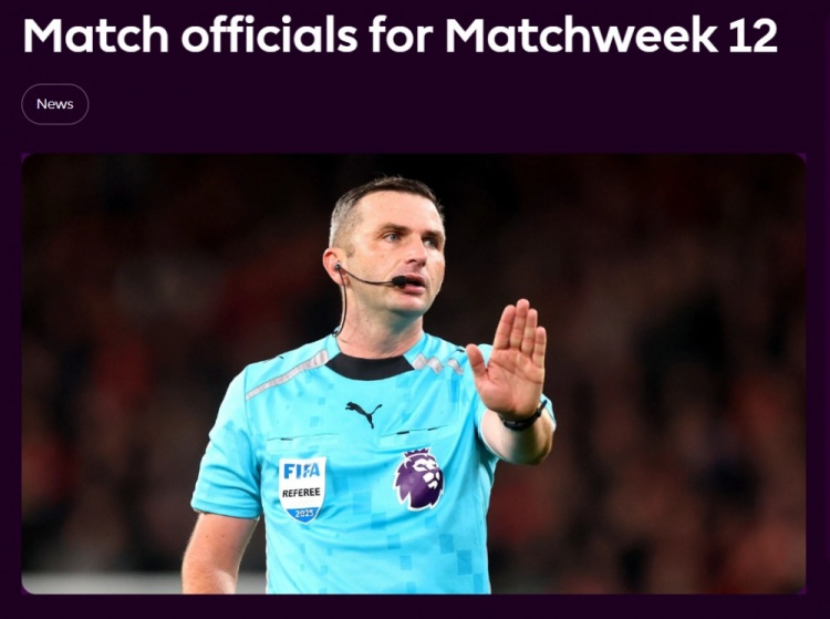 英超第12轮裁判:奥利弗执法北伦敦德比,VAR阿特