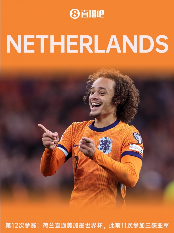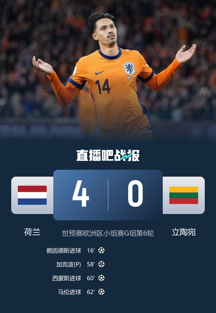 世预赛欧洲区小组赛G组第6轮,荷兰4-0立陶宛,赖因德斯、加克波传射。 【其他资讯】 还剩14席!世界杯已定34席:德国、荷兰直通2026世界杯正赛
