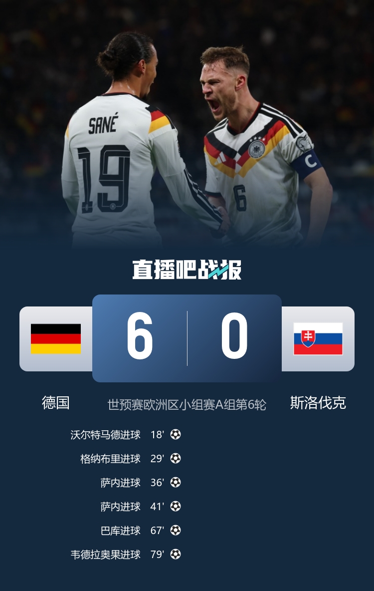 【世预赛战报】 进世界杯!德国6-0横扫斯洛伐克 维尔茨两助萨内双响格纳布里传射