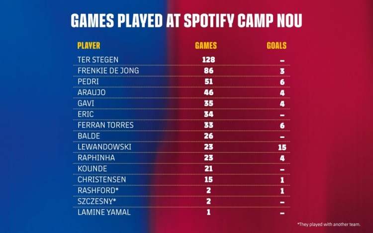 足球比分网11月19日讯 巴萨将在对阵毕巴迎来重返诺坎普之战,巴萨官方也统计了多项数据。 自上次在这座传奇球场进行比赛以来,巴萨已发生了诸多变化。上次比赛还要追溯到2023年5月28日,哈维的球队凭借法蒂的梅开二度和加维的进球横扫马洛卡。 此后,球队荣誉室又增添了一座西甲冠军、一座国王杯和一座西超杯,而汉斯·弗里克也接过了教鞭。这位德国教头尚未在新球场指挥过比赛……这一切即将改变。 保·库巴西、马尔科·伯纳尔、霍安·加西亚、赫拉德·马丁、卡萨多、费尔明、奥尔莫和鲁尼·巴德吉都从未在诺坎普踢过比赛。此外还包括几名一直随一线队训练的巴萨竞技队球员:德罗、托尼·费尔南德斯、霍弗雷·托伦茨、科亨和埃德尔·阿勒尔。 卡萨多和霍安·加西亚属于特殊情况:两人此前都曾坐在诺坎普的替补席上——卡萨多是在哈维执教时期,当时他仍正式隶属于预备队;而门将霍安·加西亚则是在2021/22和2022/23赛季西班牙人客场对阵巴萨的德比中进入大名单,但两人均未获得实际出场机会。 在当前阵容中,五位队长中的四位占据了队内诺坎普球场出场次数榜的前列:特尔施特根、弗兰基·德容、佩德里和阿劳霍。 遗憾的是,出场次数前三的球员均无法在这场主场回归战中登场。德容在上一场比赛连吃两黄后停赛,而特狮和佩德里则均有伤在身。 名单中有一个名字格外引人注目:拉明·亚马尔。他目前唯一一次在诺坎普出场正是他的一线队首秀。当时年仅15岁9个月16天的他,成为了21世纪为巴萨完成正式首秀的最年轻球员,也是俱乐部历史上出战西甲最年轻的球员。在创造了无数纪录、过人和进球之后,这位拉玛西亚的天才少年即将在诺坎普球场迎来又一个特殊之夜。 而对于沃伊切赫·什琴斯尼和马库斯·拉什福德而言,这也将是一个魔幻之夜。这可能是他们首次身披巴萨战袍在诺坎普球场作战。但他们此前曾作为对手到访过这里。 什琴斯尼曾两次在这座球场出战欧冠:一次是2011年随阿森纳,另一次是2015年随罗马。拉什福德也曾两次随曼联在此登场,一次是2018/19赛季的欧冠,另一次是2022/23赛季的欧联杯,当时他攻破了特尔施特根的十指关。 巴萨官方统计当前队内球员在诺坎普出场榜:*为仅曾代表客队在诺坎普出场 1.特尔施特根,128场,0球 2.弗兰基·德容,86场,3球 3.佩德里,51场,6球 4.阿劳霍,46场,4球 5.加维,35场,4球 6.埃里克·加西亚,34场,0球 7.费兰·托雷斯,33场,6球 8.巴尔德,26场,0球 9.莱万多夫斯基,23场,15球 10.拉菲尼亚,23场,4球 11.孔德,21场,0球 12.克里斯滕森,15场,1球 13.拉什福德*,2场,1球 14.什琴斯尼*,2场,0球 15.亚马尔,1场,0球 |