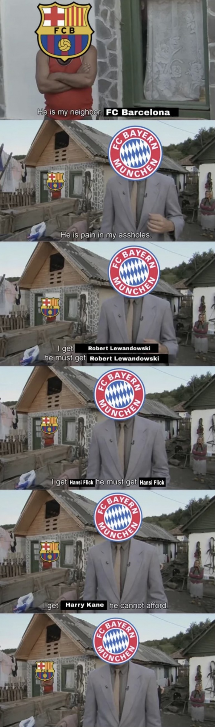拜仁:我有莱万,巴萨:那我也要 拜仁:我有弗里克,巴萨:那我也要 拜仁:我有凯恩,巴萨:那我买不起