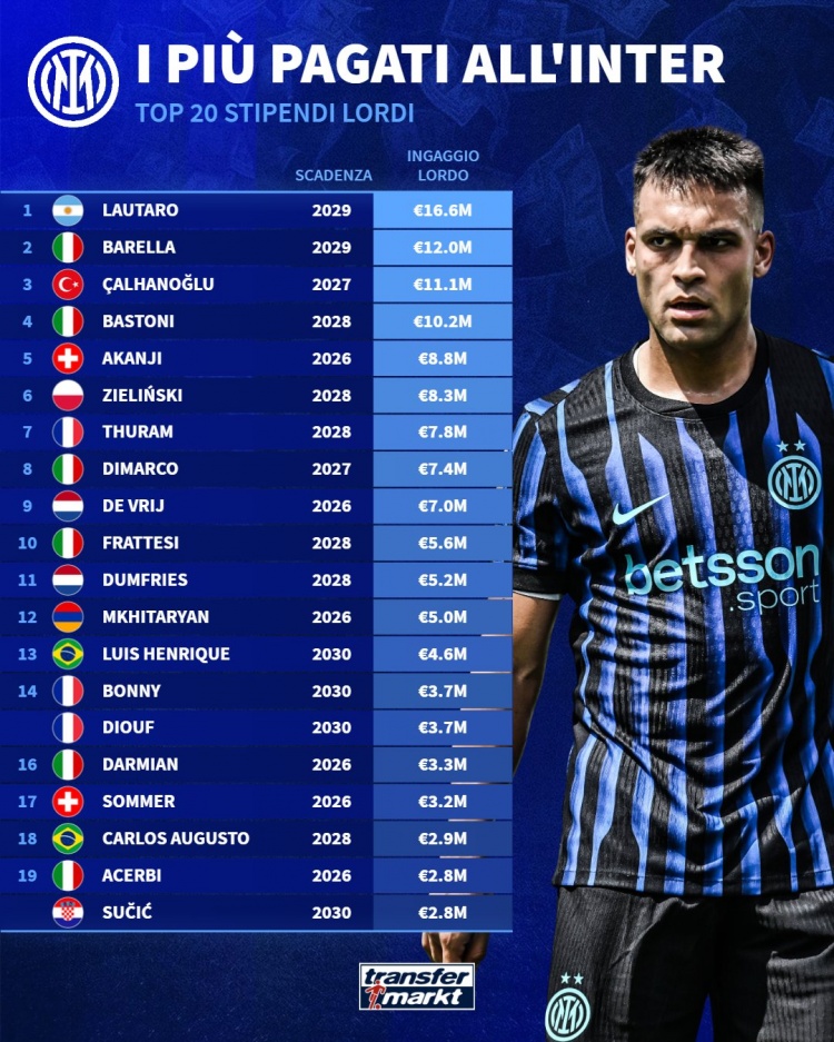 国米税前年薪排名:劳塔罗1660万欧居首,四名球