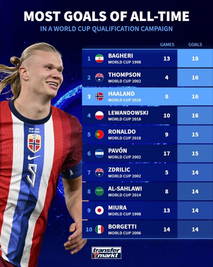 足球比分网11月18日讯 德国转会市场统计了球员在单届世预赛中的进球数量,并列出榜单,哈兰德本届世预赛打进16球排名并列第二位。 单届世预赛进球榜: 1998年世界杯预选赛——巴盖里(伊朗)——13场18球 2002年世界杯预选赛——汤普森(澳大利亚)——4场16球 2026年世界杯预选赛——哈兰德(挪威)——8场16球 2018年世界杯预选赛——莱万(波兰)——10场16球 2018年世界杯预选赛——C罗(葡萄牙)——9场15球 2002年世界杯预选赛——帕文(洪都拉斯)——17场15球 2002年世界杯预选赛——兹德里利奇(澳大利亚)——5场14球 2014年世界杯预选赛——萨赫拉维(沙特)——8场14球 1998年世界杯预选赛——三浦知良(日本)——13场14球 2006年世界杯预选赛——博尔格蒂(墨西哥)——14场14球