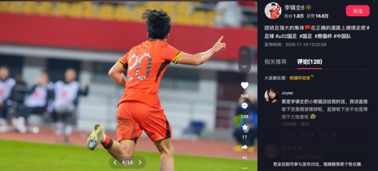 足球比分网11月19日讯 在个人社媒,U22国足球员李镇全总结熊猫杯。 2025年熊猫杯落下帷幕,U22国足1胜1平1负获得亚军,李镇全表现不俗,他在对阵韩国时打入一球但被吹无效。 今天,李镇全在个人社媒总结熊猫杯,他写道:团结且强大的集体,在正确的道路上继续走吧。