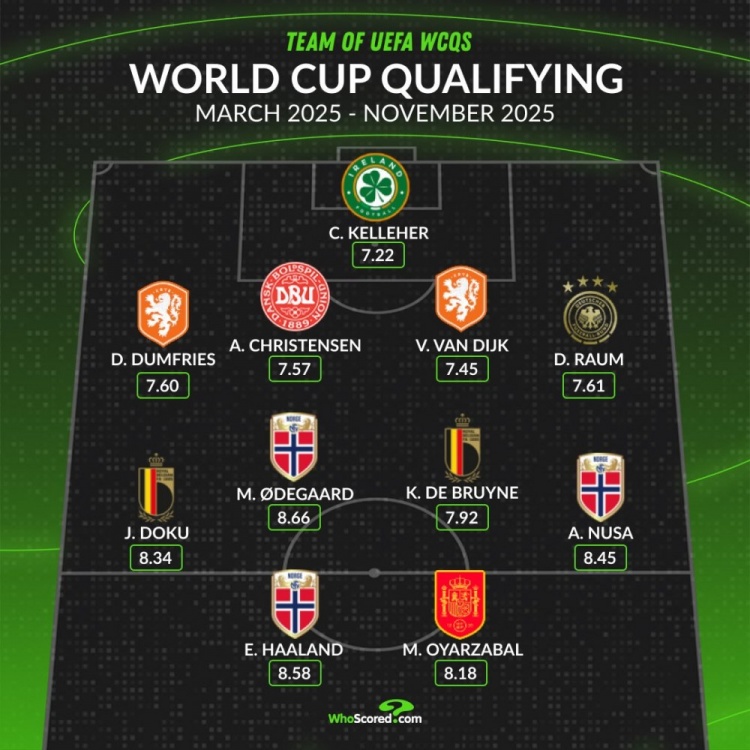 足球比分网11月20日讯 本届世欧预小组赛已经告一段落,whoscored也评出了本届世欧预评分最佳阵容,多位名将在列。 whoscored评本届世欧预最佳阵:2025年3月-11月 门将:凯莱赫(爱尔兰,7.22分) 后卫:邓弗里斯(荷兰,7.60分)、克里斯滕森(丹麦,7.57分)、范戴克(荷兰,7.45分)、劳姆(德国,7.61分) 中场:多库(比利时,8.34分)、厄德高(挪威,8.66分)、德布劳内(比利时,7.92分)、安东尼奥·努萨(挪威,8.45分) 前锋:哈兰德(挪威,8.58分)、奥亚萨瓦尔(西班牙,8.18分) |
