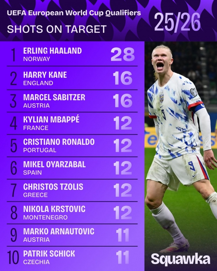 足球比分网11月20日讯 本届世欧预小组赛已经告一段落,squakwa也统计了本届赛事射正情况,哈兰德断崖领跑。 本届世欧预射正榜: 1.埃尔林·哈兰德(挪威),28次 2.哈里·凯恩(英格兰),16次 3.马塞尔·萨比策(奥地利),16次 4.基利安·姆巴佩(法国),12次 5.克里斯蒂亚诺·罗纳尔多(葡萄牙),12次 6.米克尔·奥亚萨瓦尔(西班牙),12次 7.克里斯托斯·佐利斯(希腊),12次 8.尼古拉·克尔斯托维奇(黑山),12次 9.马尔科·阿瑙托维奇(奥地利),11次 10.帕特里克·希克(捷克),11次