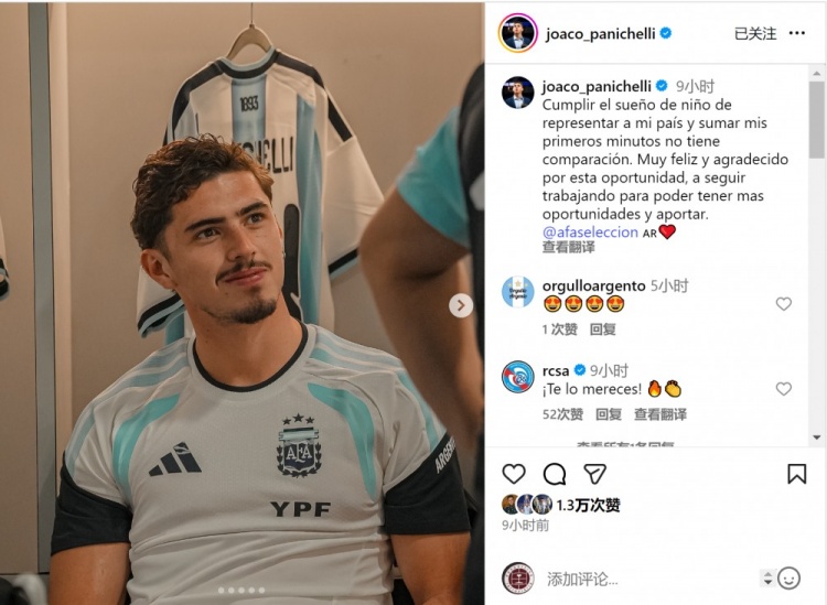 帕尼切利社媒谈阿根廷队首秀:实现儿时梦想,