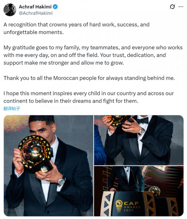 足球比分网11月20日讯 阿什拉夫当选2025年非洲足球先生,他在社交媒体上晒出领奖照片,发表获奖感言。 阿什拉夫写道:“这份认可是对我多年辛勤付出、成功经历与难忘时刻的加冕。我衷心感谢我的家人、队友以及所有与我并肩作战的人们——无论场上还是场下。你们的信任、奉献与支持让我日益强大,助我不断成长。 感谢所有摩洛哥民众始终如一的支持,愿此刻的荣耀激励祖国乃至整个非洲大陆的每个孩子,坚信梦想并为之奋斗。” |