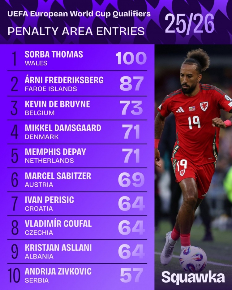 世预赛进入禁区次数榜:德布劳内73次列第三,德