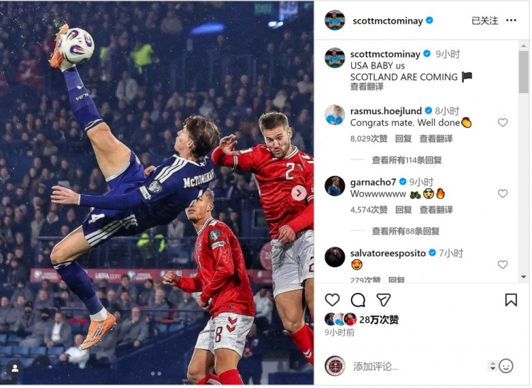 足球比分网11月20日讯 世预赛欧洲区最后一轮比赛,麦克托米奈倒钩破门,苏格兰主场4-2击败丹麦,直通世界杯,丹麦则需参加附加赛。 麦克托米奈社媒庆祝球队进入世界杯,配文:“美国宝贝,苏格兰来了!” 丹麦前锋霍伊伦留言祝贺俱乐部队友:“祝贺你,兄弟,做得好!” 一些球迷对霍伊伦刚输球就祝贺麦克托米奈感到不满 “这哥们不是认真的吧。” “兄弟,你可刚输了比赛。” 不过大多数球迷都称赞霍伊伦的风度 “很有风度,祝你们附加赛好运!” “附加赛好运,今晚你已经拼尽全力。” “真正的体育精神。” |