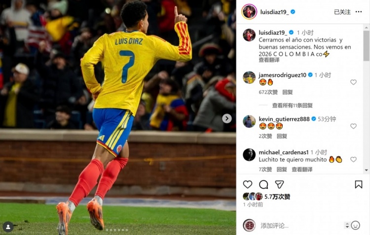 足球比分网11月20日讯 哥伦比亚对阵澳大利亚的友谊赛,路易斯·迪亚斯破门,帮助哥伦比亚3-0取胜。 迪亚斯社媒晒出庆祝进球的照片,配文:“我们以胜利和美妙的感觉为2025年收官,2026年见,哥伦比亚球迷们!” |
