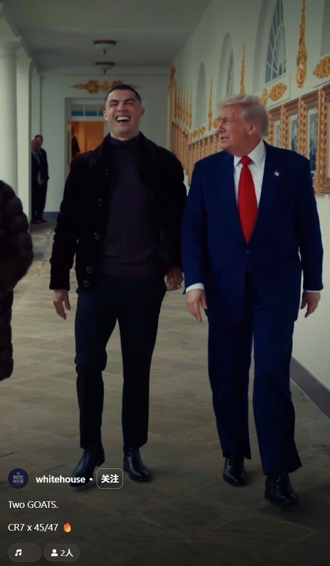 白宫官方社媒晒C罗与特朗普同行视频,配文:两
