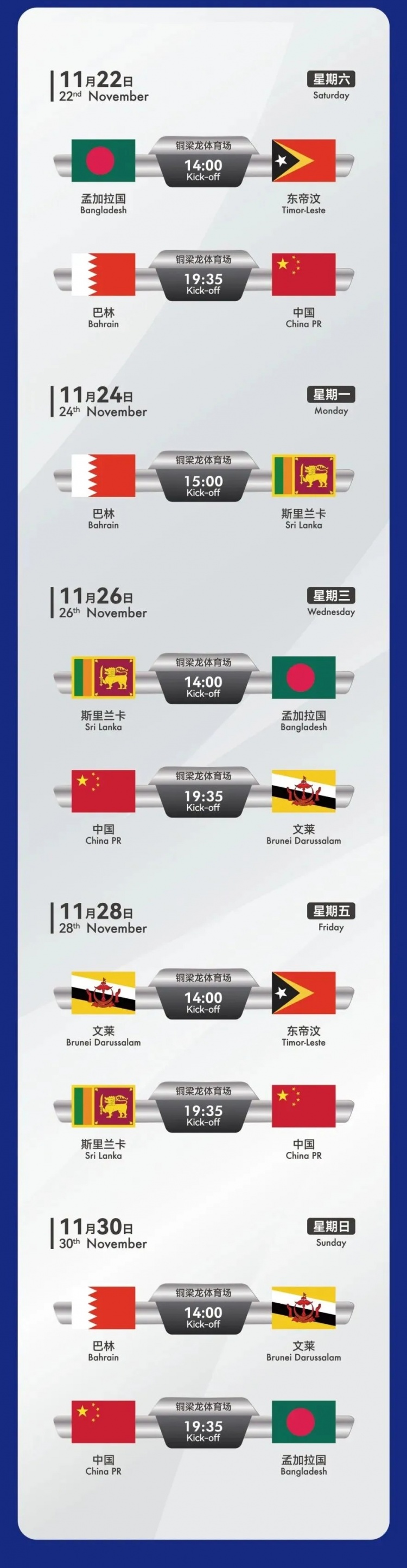 足球比分网11月20日讯 国足U16将在11月22日-30日坐镇铜梁龙体育场,迎战与巴林、东帝汶、文莱、斯里兰卡和孟加拉国同组,小组头名将直接晋级U17亚洲杯决赛圈。 具体赛程如下: