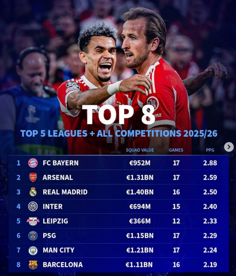 足球比分网11月21日讯 五大联赛即将重燃战火,《转会市场》统计了本赛季至今五大联赛球队的各项赛事场均拿分情况,即将在欧冠正面对决的拜仁和阿森纳分列前二。 五大联赛球队本赛季各项赛事场均拿分榜:(及球队总身价) 1.拜仁慕尼黑,9.52亿欧元,17场,2.88分 2.阿森纳,13.1亿欧元,17场,2.59分 3.皇家马德里,14亿欧元,16场,2.50分 4.国际米兰,6.94亿欧元,15场,2.40分 5.莱比锡,3.66亿欧元,12场,2.33分 6.巴黎圣日耳曼,11.5亿欧元,17场,2.29分 7.曼城,12.1亿欧元,17场,2.24分 8.巴塞罗那,11.1亿欧元,16场,2.19分