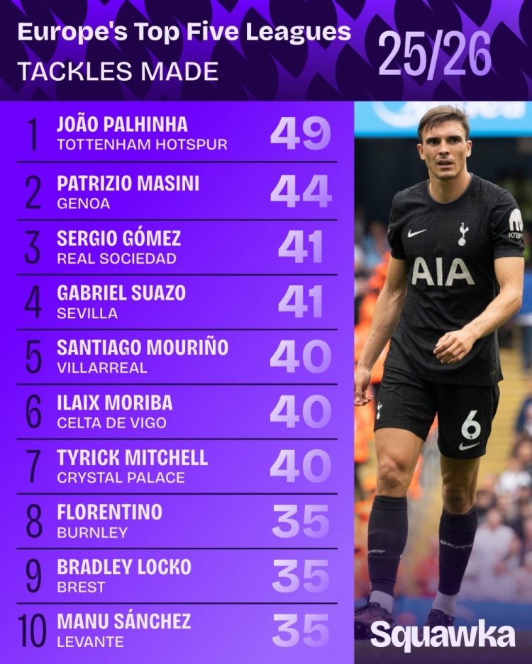 足球比分网11月21日讯 Squawka统计了本赛季球员在五大联赛成功抢断的次数,并列出榜单,帕利尼亚49次居首。 本赛季五大联赛成功抢断排名: 帕利尼亚(热刺)——49 马西尼(热那亚)——44 塞尔吉奥·戈麦斯(皇家社会)——41 苏亚佐(塞维利亚)——41 圣地亚哥·穆里尼奥(比利亚雷亚尔)——40 莫里巴(塞尔塔)——40 蒂里克·米切尔(水晶宫)——40 弗洛伦蒂诺(伯恩利)——35 布拉德利·罗科罗(布雷斯特)——35 马努·桑切斯(莱万特)——35 |