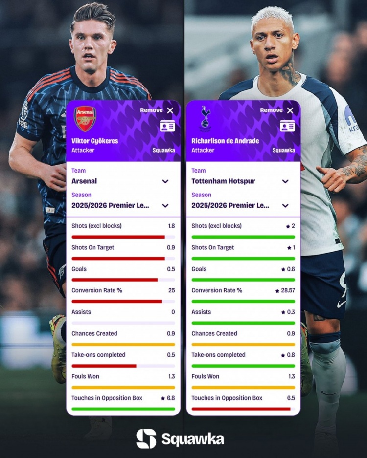 足球比分网11月21日讯 英超即将战火重燃,北伦敦德比备受瞩目。数据机构squakwa也对比了两队中锋约克雷斯和里沙利松本赛季英超场均关键数据情况,后者多项数据占优。 约克雷斯(阿森纳)2025/26赛季英超场均数据: - 射门(不含被封堵):1.8次 - 射正:0.9次 - 进球:0.5球 - 射门转化率:25% - 助攻:0次 - 创造机会:0.9次 - 成功过人:0.5次 - 造犯规:1.3次 - 对方禁区触球:6.8次 里沙利松(托特纳姆热刺)2025/26赛季英超场均数据: - 射门(不含被封堵):2.0次 - 射正:1.0次 - 进球:0.6球 - 射门转化率:28.57% - 助攻:0.3次 - 创造机会:0.9次 - 成功过人:0.8次 - 造犯规:1.3次 - 对方禁区触球:6.5次 |